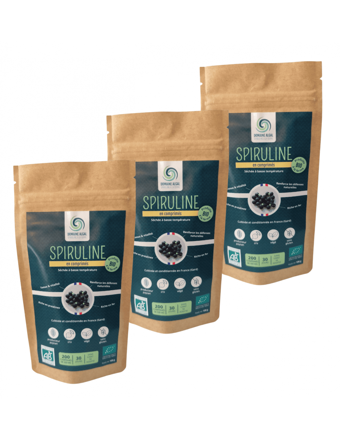 Spiruline AB en comprimés. Spiruline française issue de l'Agriculture Biologique 100% pure. Conditionnées en 3 sachets de 100 g